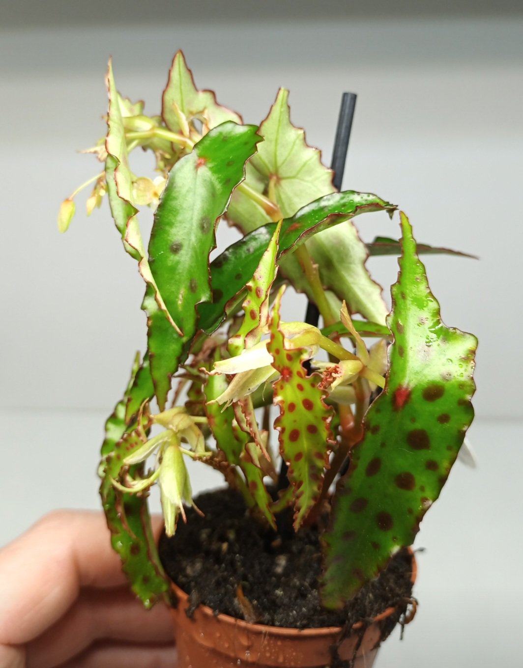 egonia amphioxus est une espèce rare et spectaculaire au port compact. Ses feuilles allongées, vert clair, finement ponctuées de taches pourpres et terminées en pointe, lui donnent un aspect presque exotique et aquatique. Cette plante attire l’œil par ses contrastes de couleurs et sa silhouette unique dans un terrarium tropical.