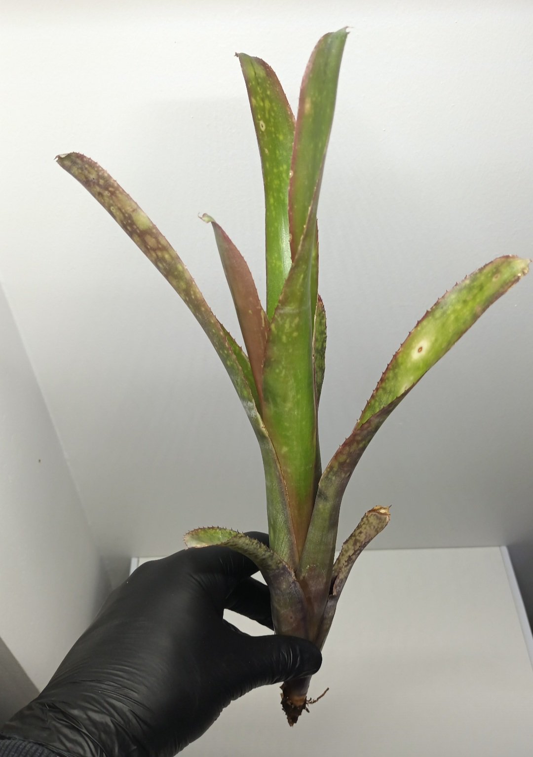 Feuillage : les feuilles sont coriaces, plus rigides, généralement dressées en forme tubulaire ou campanulée (forme de “tank” ou réservoir central). La couleur dominante tend vers un rouge-pourpre / pourpre sombre avec des taches claires ou points blancs, très visibles selon la lumière.