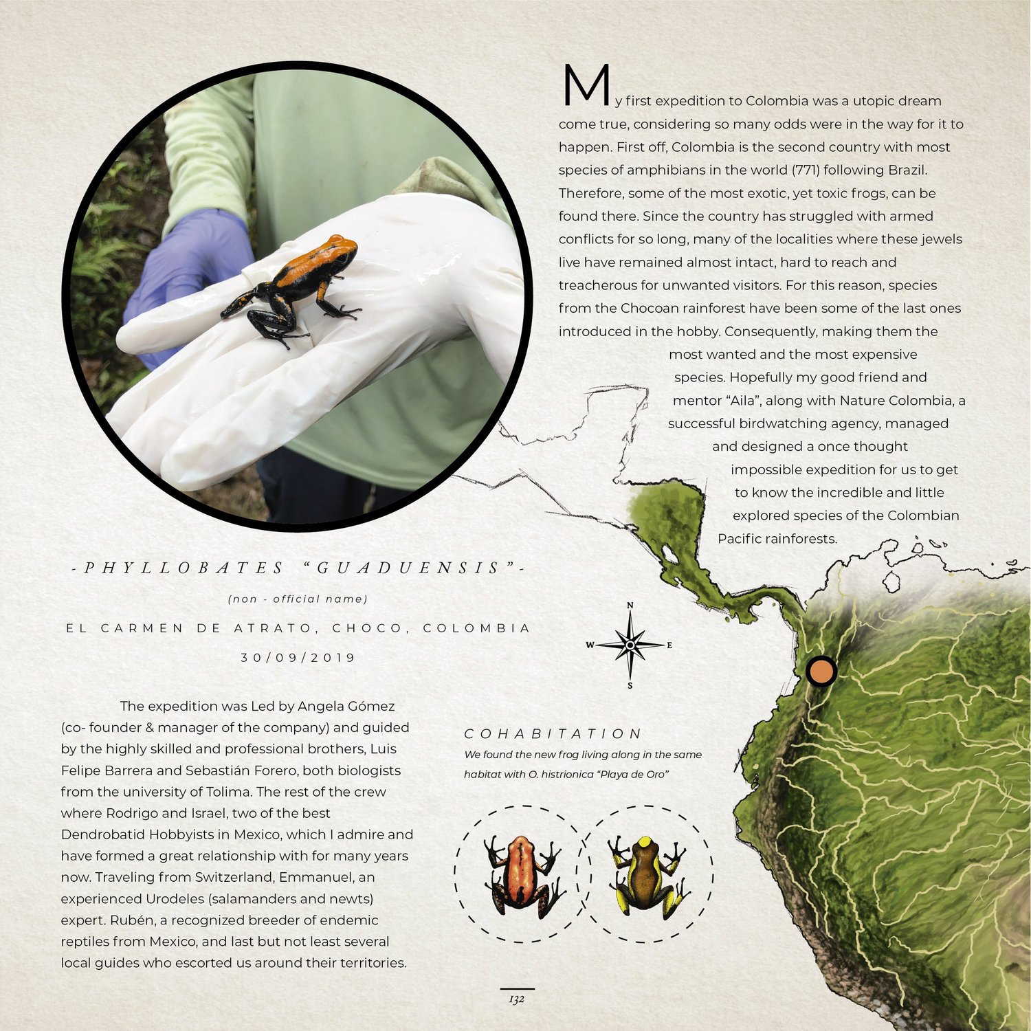 Sa plus grande source de connaissances et d’inspiration provient de ses expéditions sur le terrain à la découverte des denses forêts tropicales d’Amérique du Sud, où en 2019, avec son équipe, il a découvert une nouvelle espèce du genre Phyllobates dans une région reculée du Chocó colombien (actuellement en cours de description).