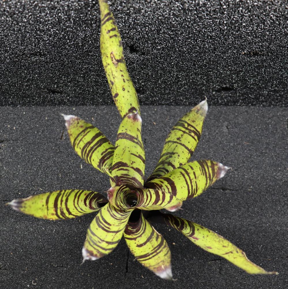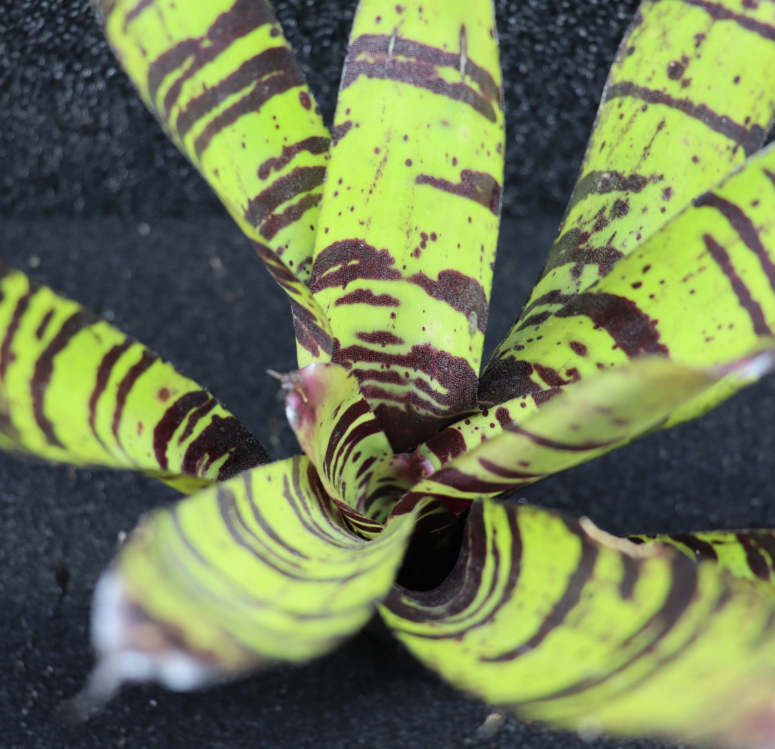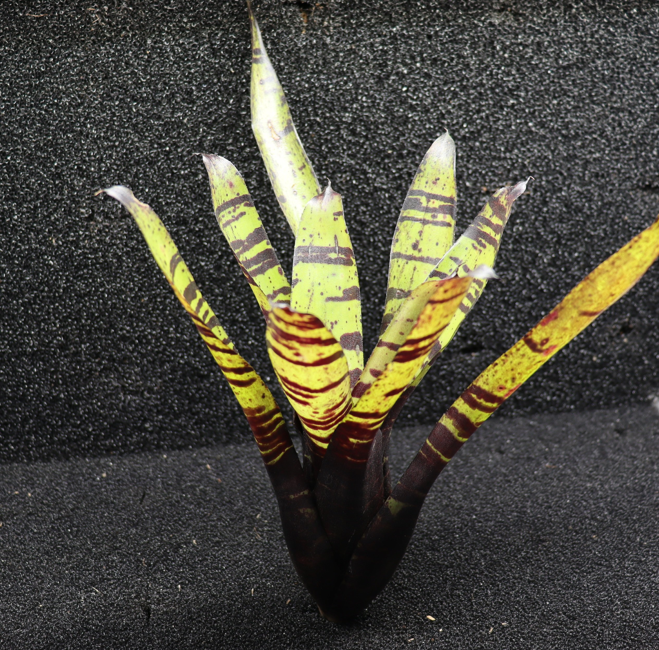 Neoregelia ‘Blueberry Tiger’ est une broméliacée très décorative, idéale pour les terrariums tropicaux grâce à son feuillage intensément contrasté et graphique. Elle forme une rosette compacte aux feuilles larges et brillantes, présentant une base vert clair à vert tendre, fortement marquée de zébrures pourpre foncé à violet, évoquant un motif tigré unique. Sous forte luminosité, le centre de la rosette peut prendre des nuances rosées à violacées, renforçant son aspect spectaculaire. Son diamètre moyen se situe autour de 15 à 20 cm, ce qui en fait une plante de caractère, parfaite comme point focal.