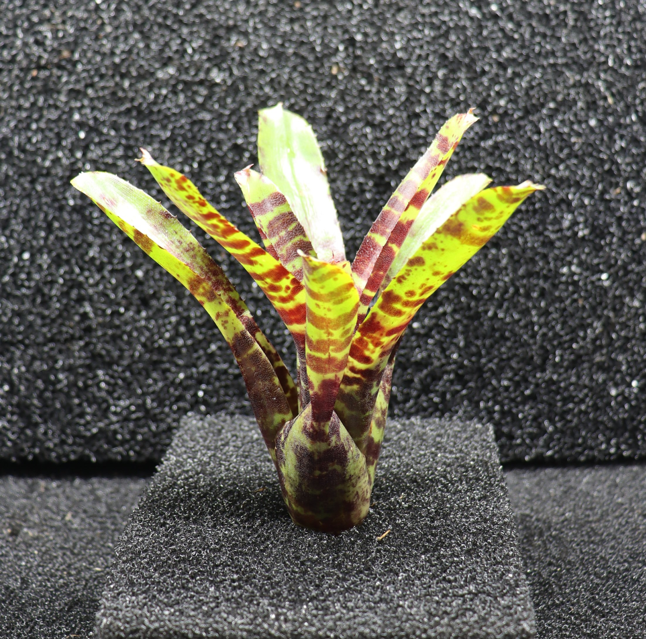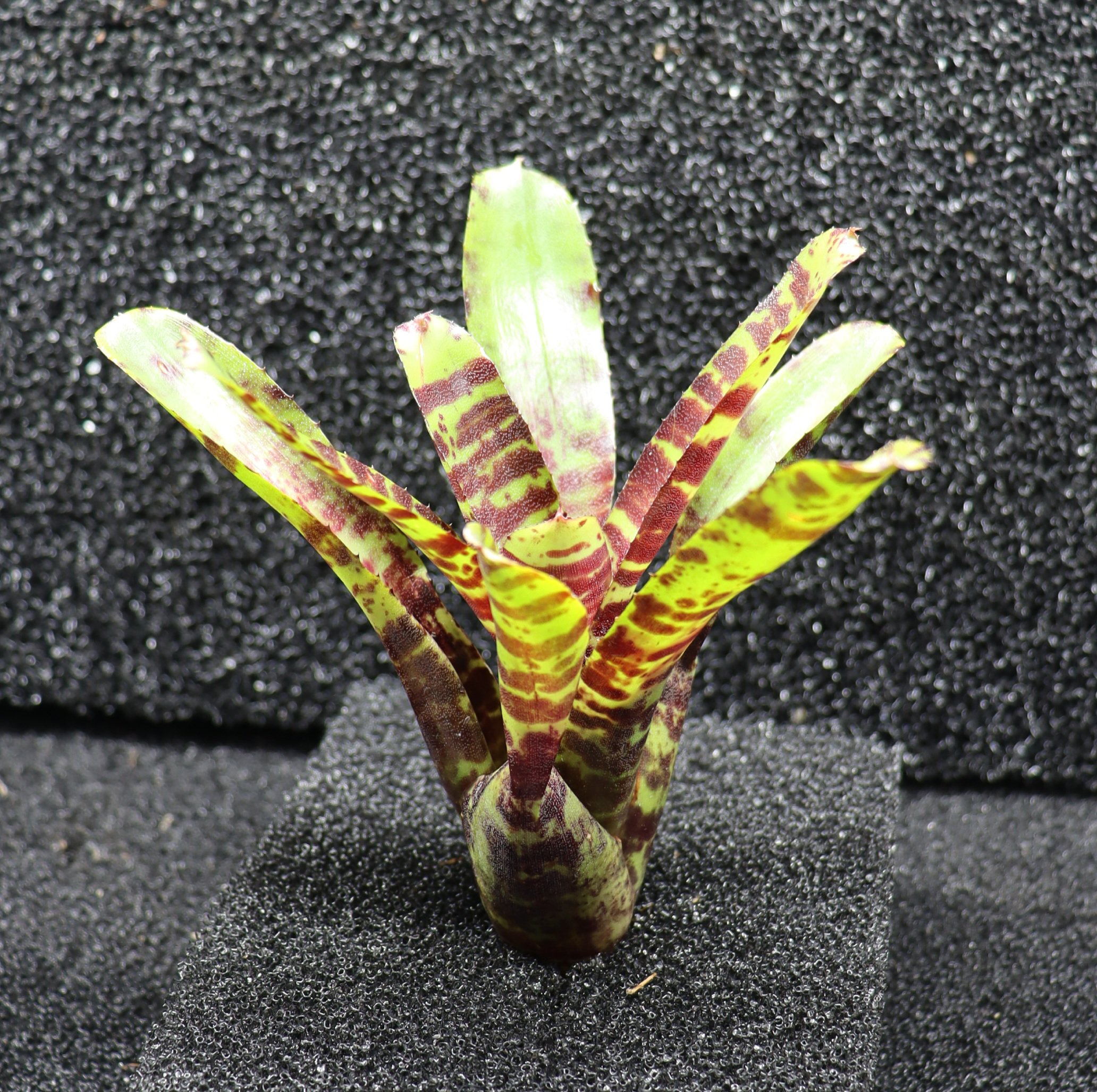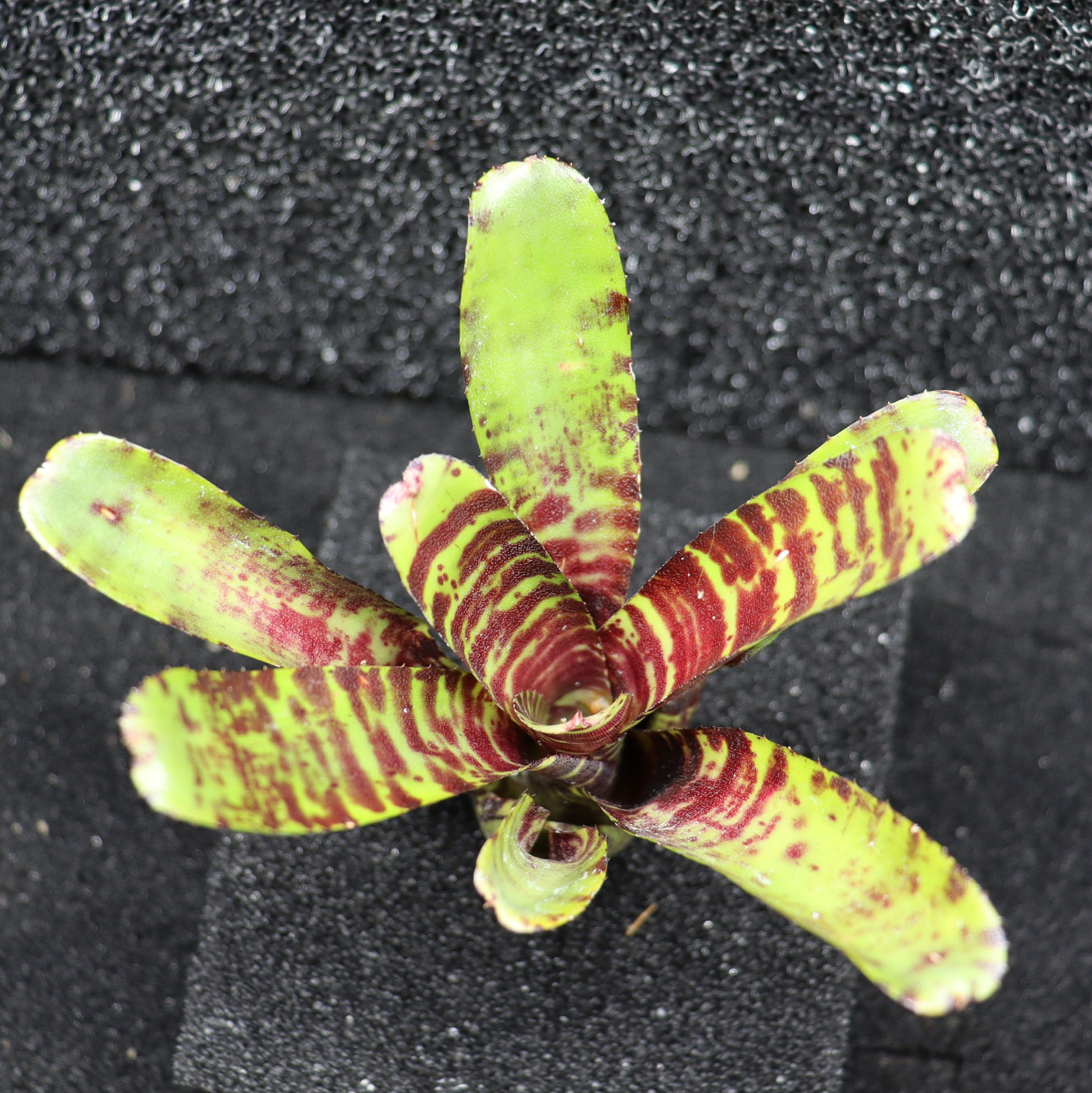 Neoregelia ‘Da Kine’ est une broméliacée hybride compacte, formant une rosette d’environ 15 cm de diamètre. Le feuillage est dense, aux feuilles moyennement étroites, vert moyen à la base, fortement croisées, avec des teintes d’acajou à rouge foncé très marquées, surtout sur les zones centrales ou intérieures.