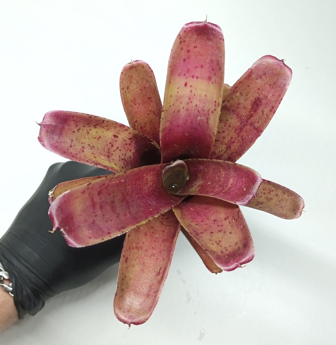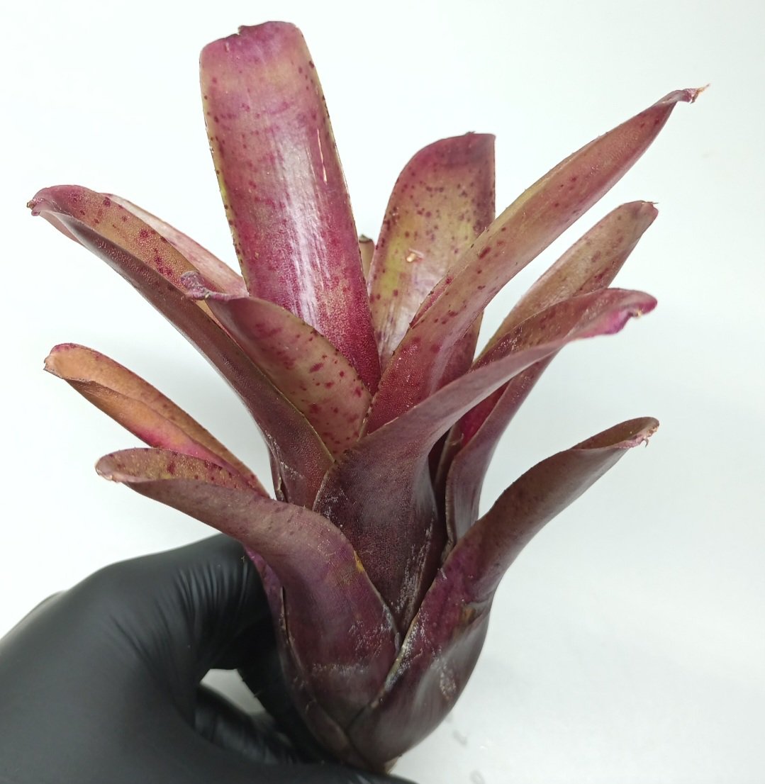 Hybride horticole dérivé de la célèbre Neoregelia ‘Fireball’, sélectionné pour son motif naturellement tacheté et sa coloration intensifiée. Les espèces parentes proviennent des forêts humides du Brésil.