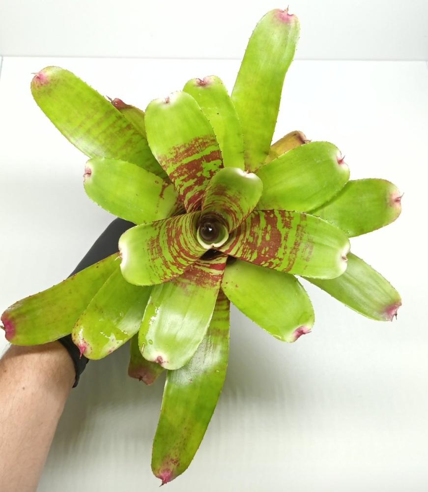 Neoregelia ‘Fishnet’ est une broméliacée hybride compacte, formant une rosette d’environ 18 à 20 cm de diamètre. Son feuillage est vert clair à moyen, finement tacheté de pourpre à bordeaux créant un motif en “filet” très graphique — d’où son nom “Fishnet”. L’aspect devient encore plus spectaculaire lorsque la plante est bien éclairée, accentuant le contraste entre les zones claires et les ponctuations sombres.