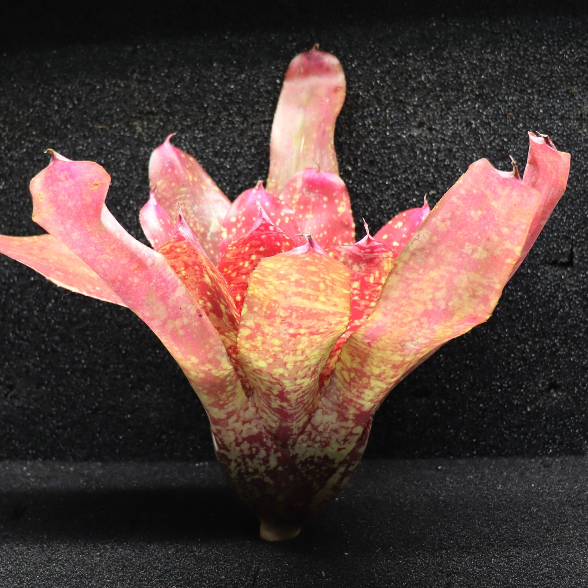 Hybride horticole du genre Neoregelia, issu de sélections à partir d’espèces originaires des forêts tropicales humides du Brésil.