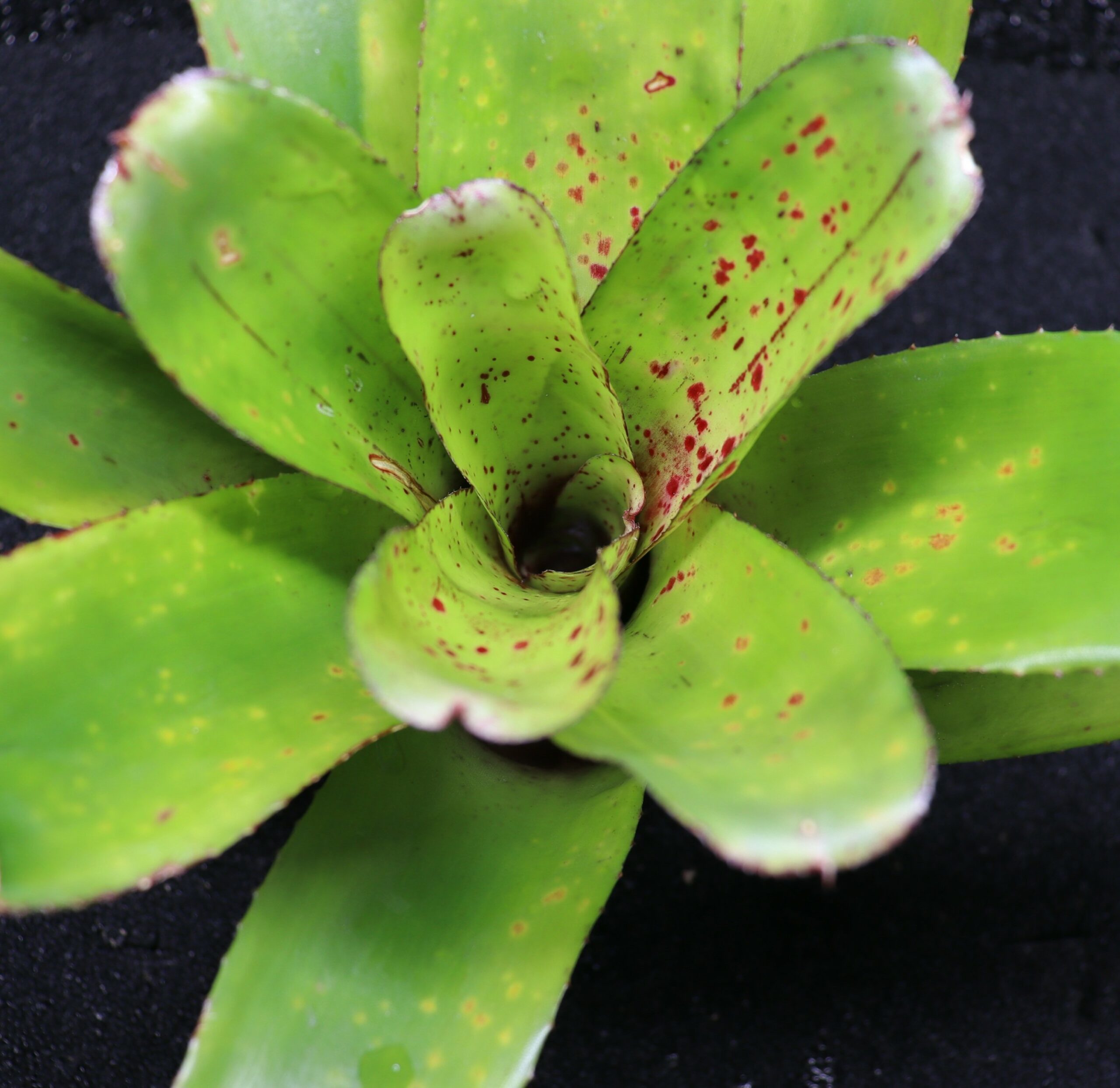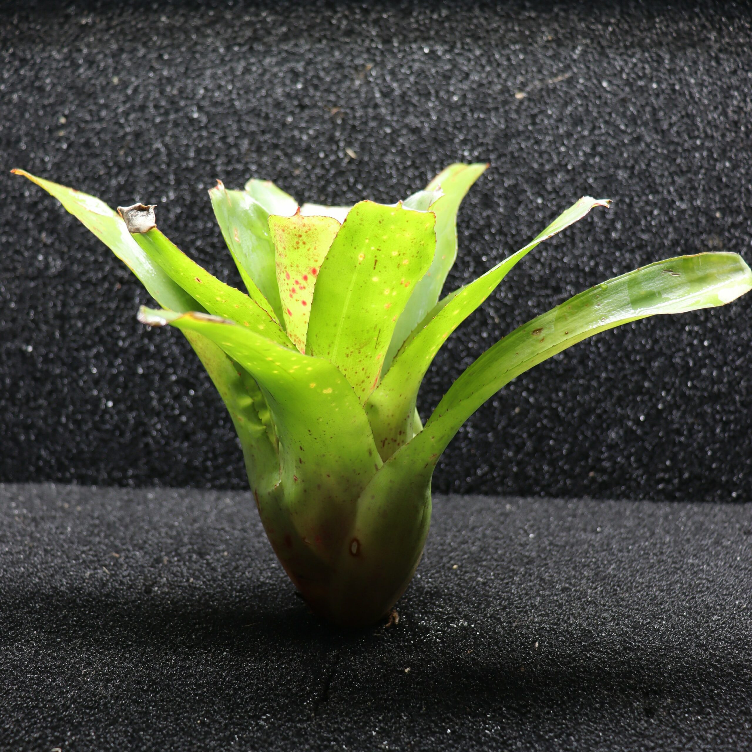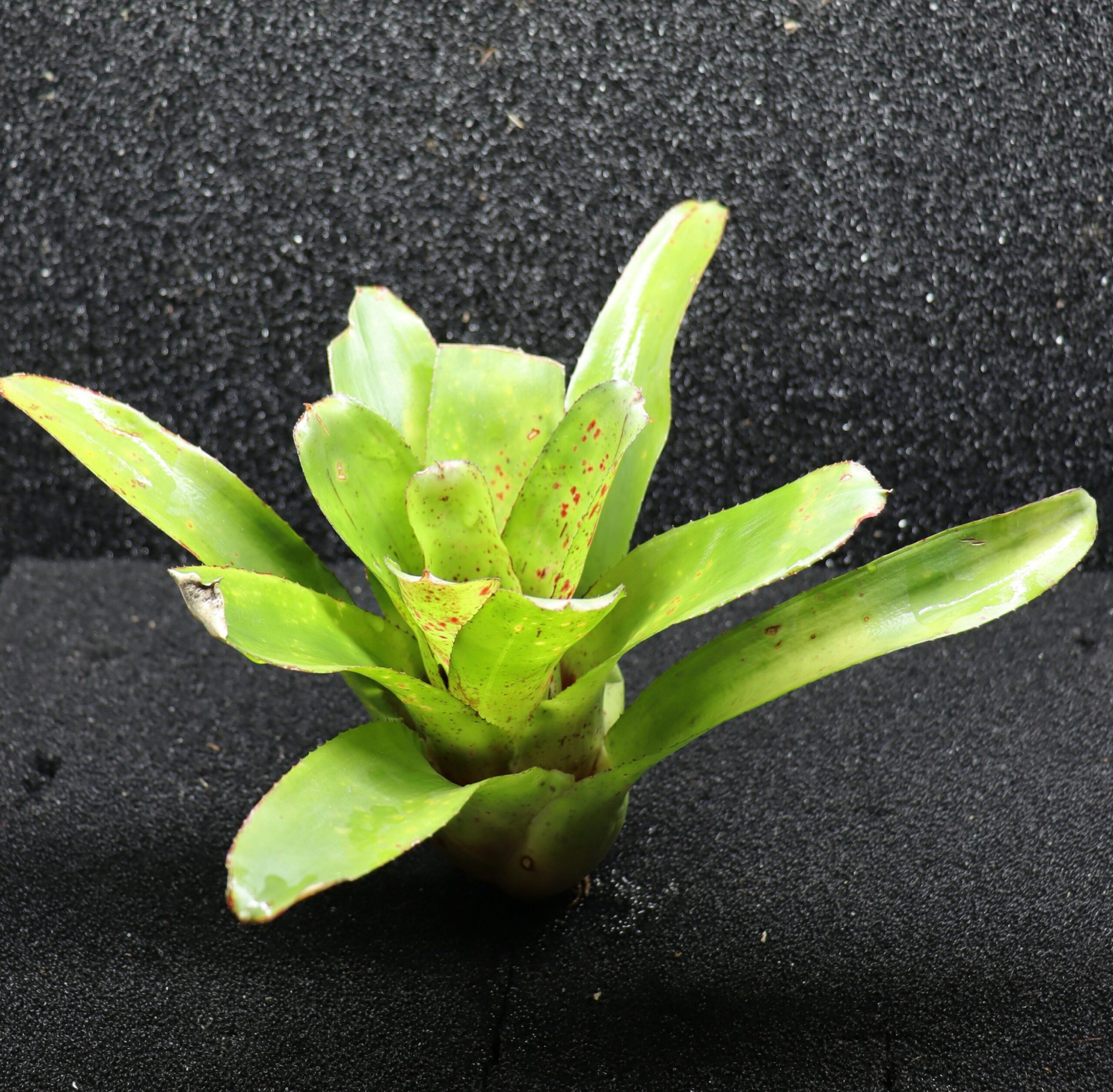 Neoregelia ‘Green Spot’ est une broméliacée miniature à compacte (environ 10 à 15 cm de diamètre), appréciée pour son feuillage vert clair à vert vif parsemé de petites taches ou mouchetures rouges, bordeaux ou pourpres. Son apparence ponctuée lui donne un look original et vivant, et son cœur peut prendre une teinte rouge lors de la floraison.