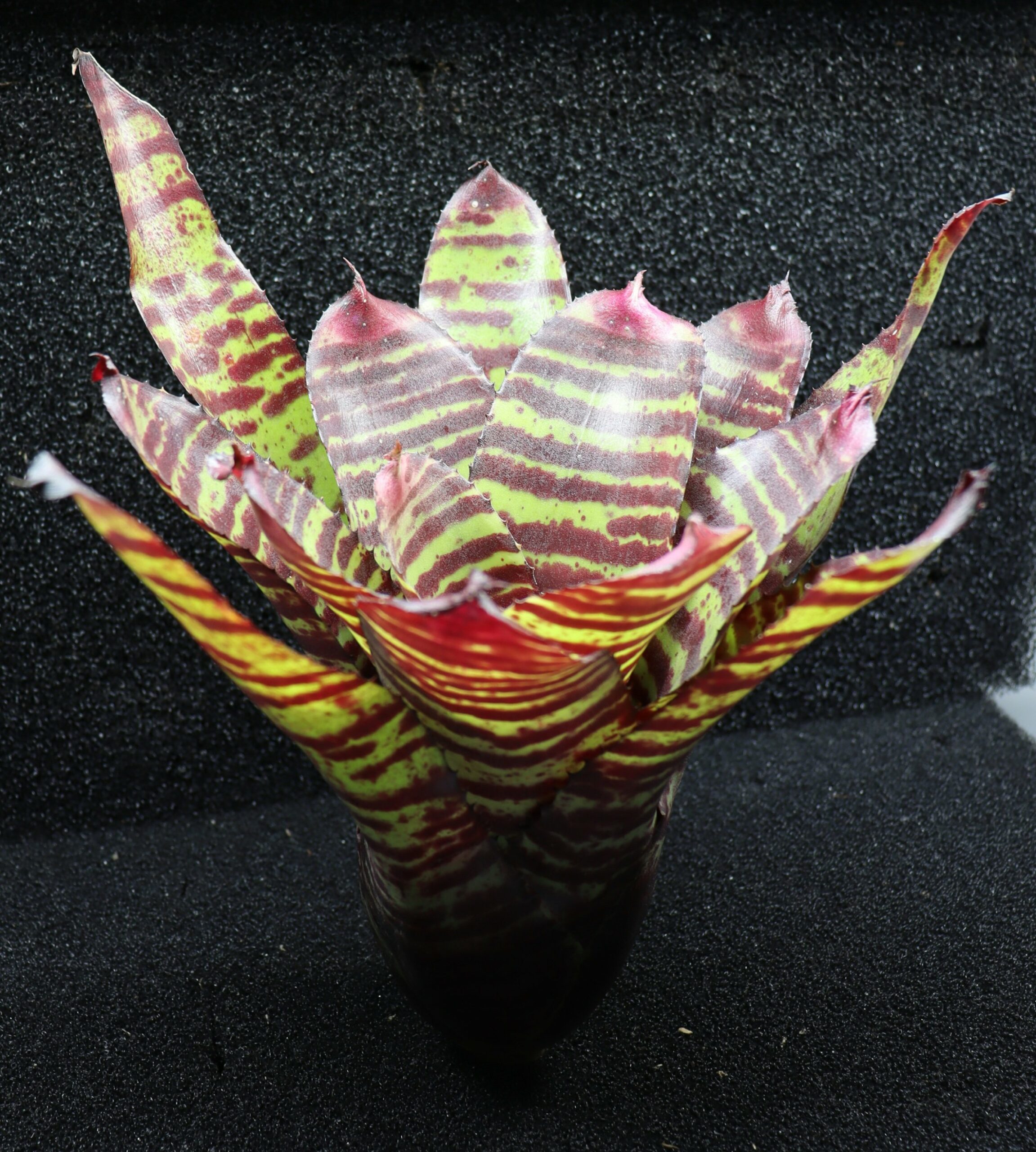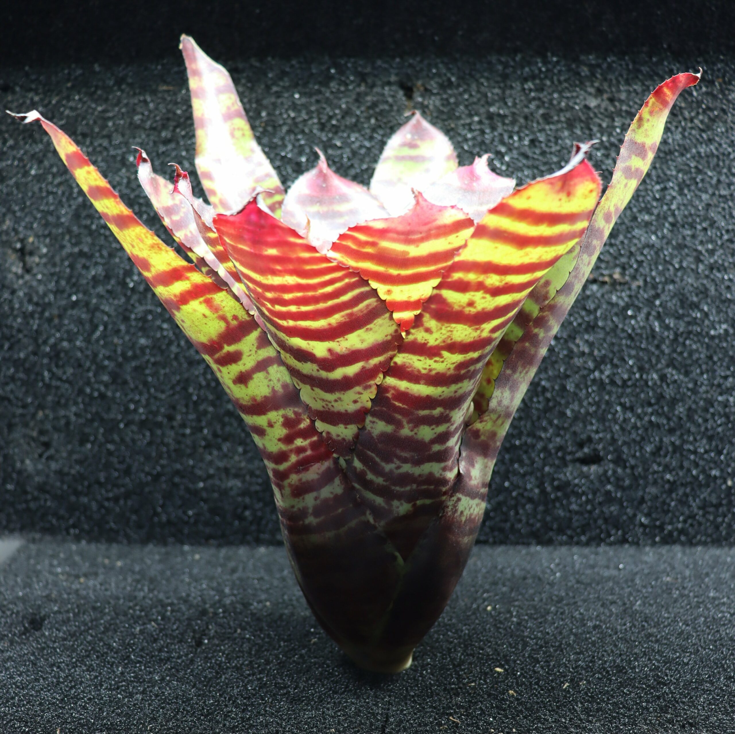 Neoregelia ‘High Voltage’ est une broméliacée très spectaculaire, parfaitement adaptée aux terrariums tropicaux, reconnaissable à son feuillage ultra contrasté et lumineux. Elle forme une rosette bien ouverte aux feuilles larges, brillantes et légèrement arquées, d’un jaune électrique à vert citron, intensément marquées de zébrures et d’éclaboussures rouge vif à pourpre. Sous forte luminosité, les couleurs gagnent encore en intensité, donnant à la plante un aspect presque fluorescent. Son diamètre moyen, d’environ 15 à 20 cm, en fait une pièce maîtresse idéale dans un décor tropical.