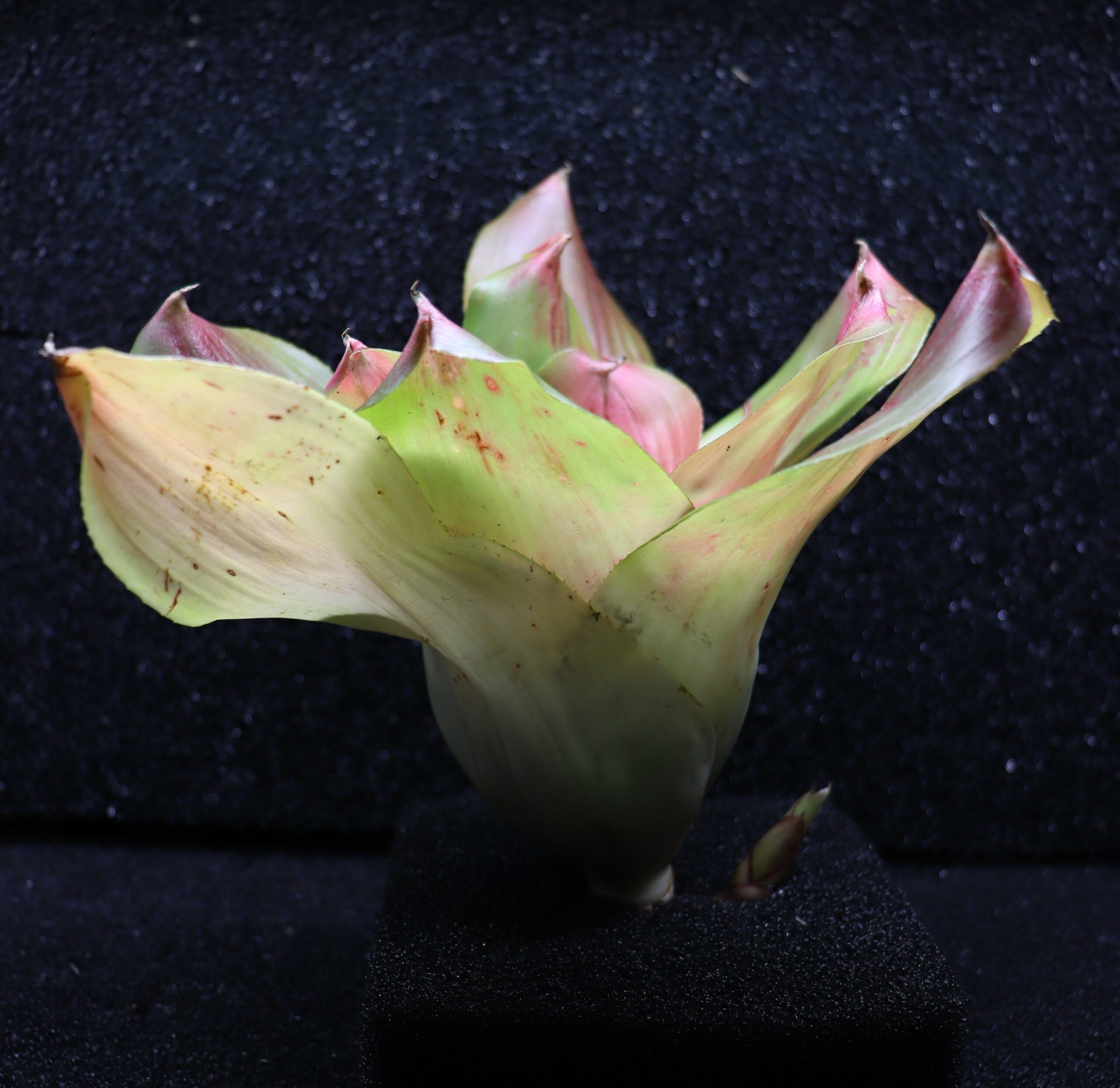 💦 Arrosage : Maintenir un léger volume d’eau propre dans la rosette centrale, renouvelé régulièrement. Brumiser chaque jour pour imiter l’ambiance tropicale humide.