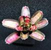 Neoregelia ‘Sweet Ice Cream’ est une broméliacée hybride compacte (12 à 16 cm de diamètre), qui séduit par son feuillage doux et gourmand aux teintes pastel. Ses feuilles sont crème ou vert très pâle, largement marbrées ou striées de rose bonbon à rose violacé, parfois avec des touches de framboise en bordure. À la floraison, le cœur peut se teinter de rose plus soutenu, ajoutant une note vive à cette palette délicate.