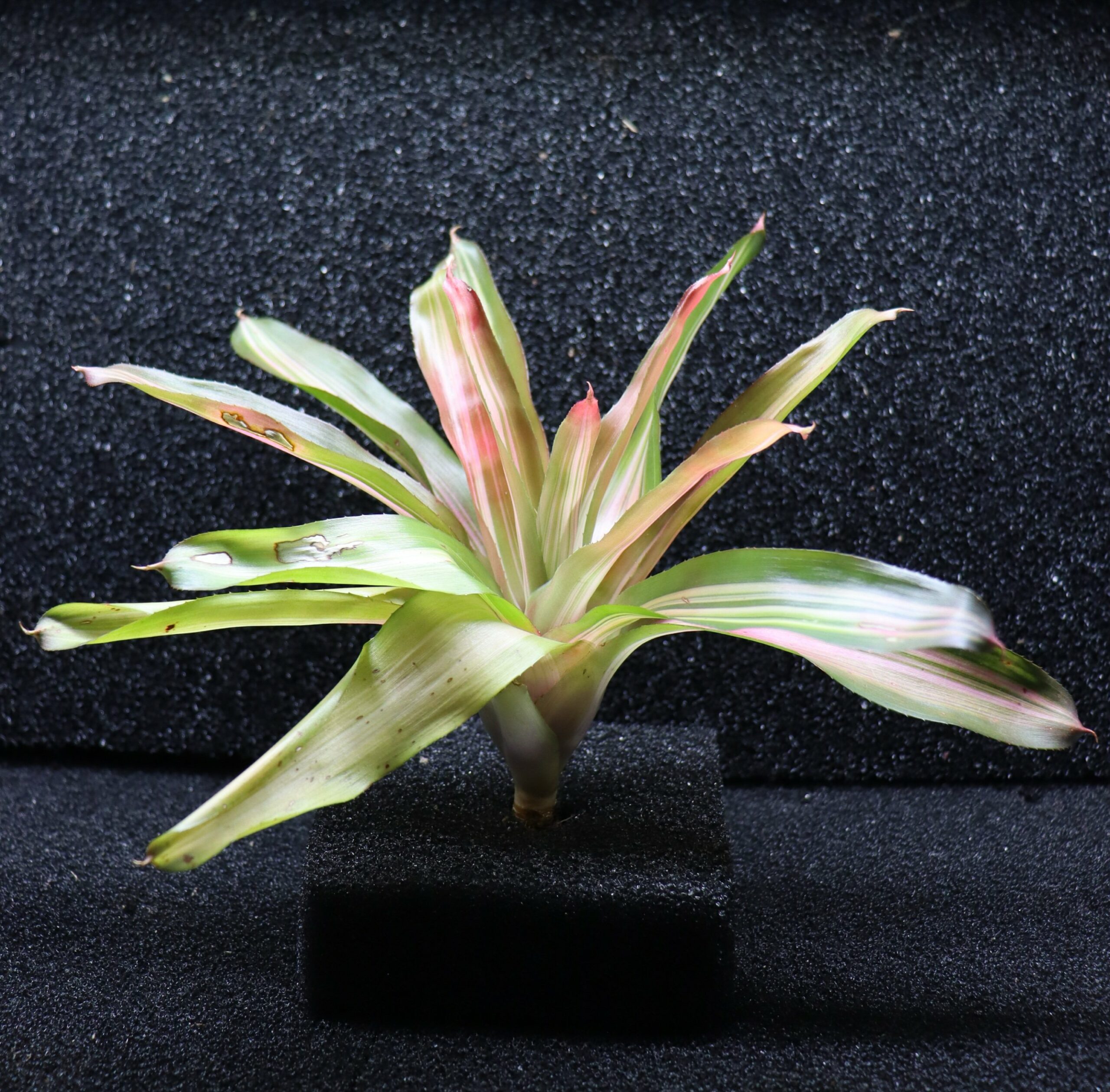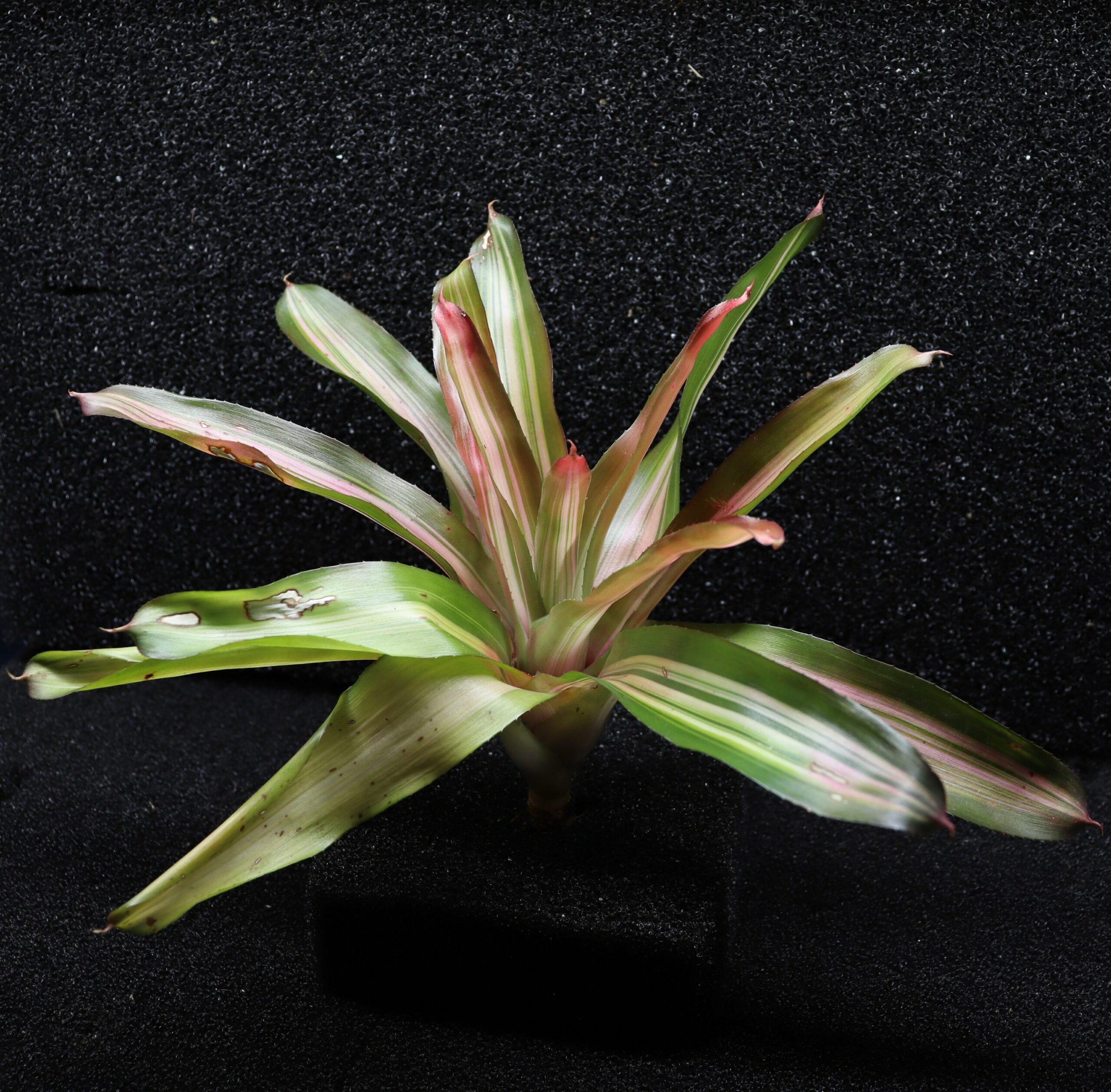 Neoregelia ‘Tricolor’ est une broméliacée hybride compacte (12 à 16 cm de diamètre), reconnue pour son feuillage tricolore aux nuances vert, rose et crème. Les feuilles présentent un dégradé harmonieux, souvent avec des bandes ou taches roses et blanches sur un fond vert clair, offrant un effet visuel très dynamique et coloré. Le centre peut virer au rose vif ou rouge à la floraison, mettant en valeur son aspect décoratif.