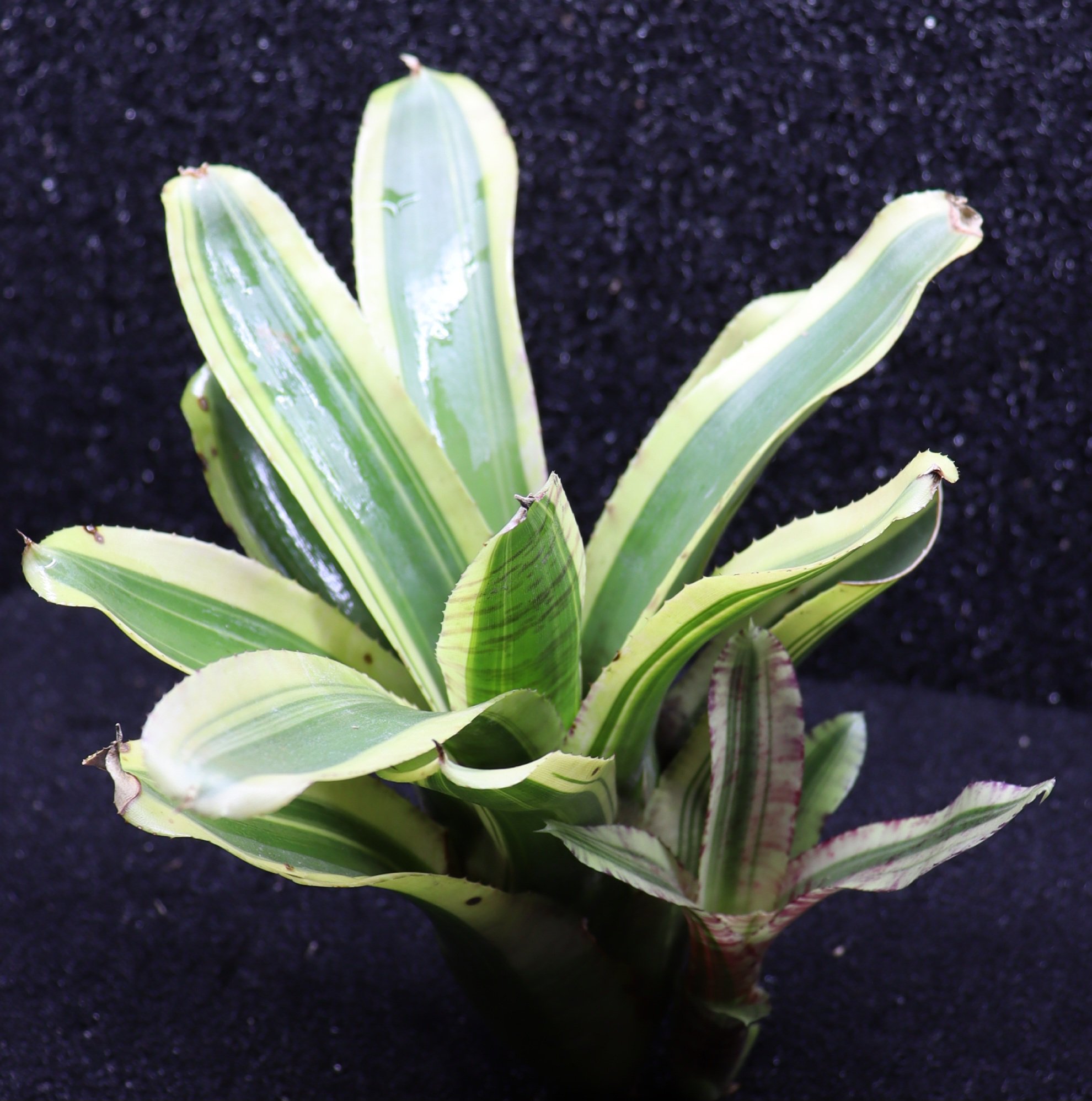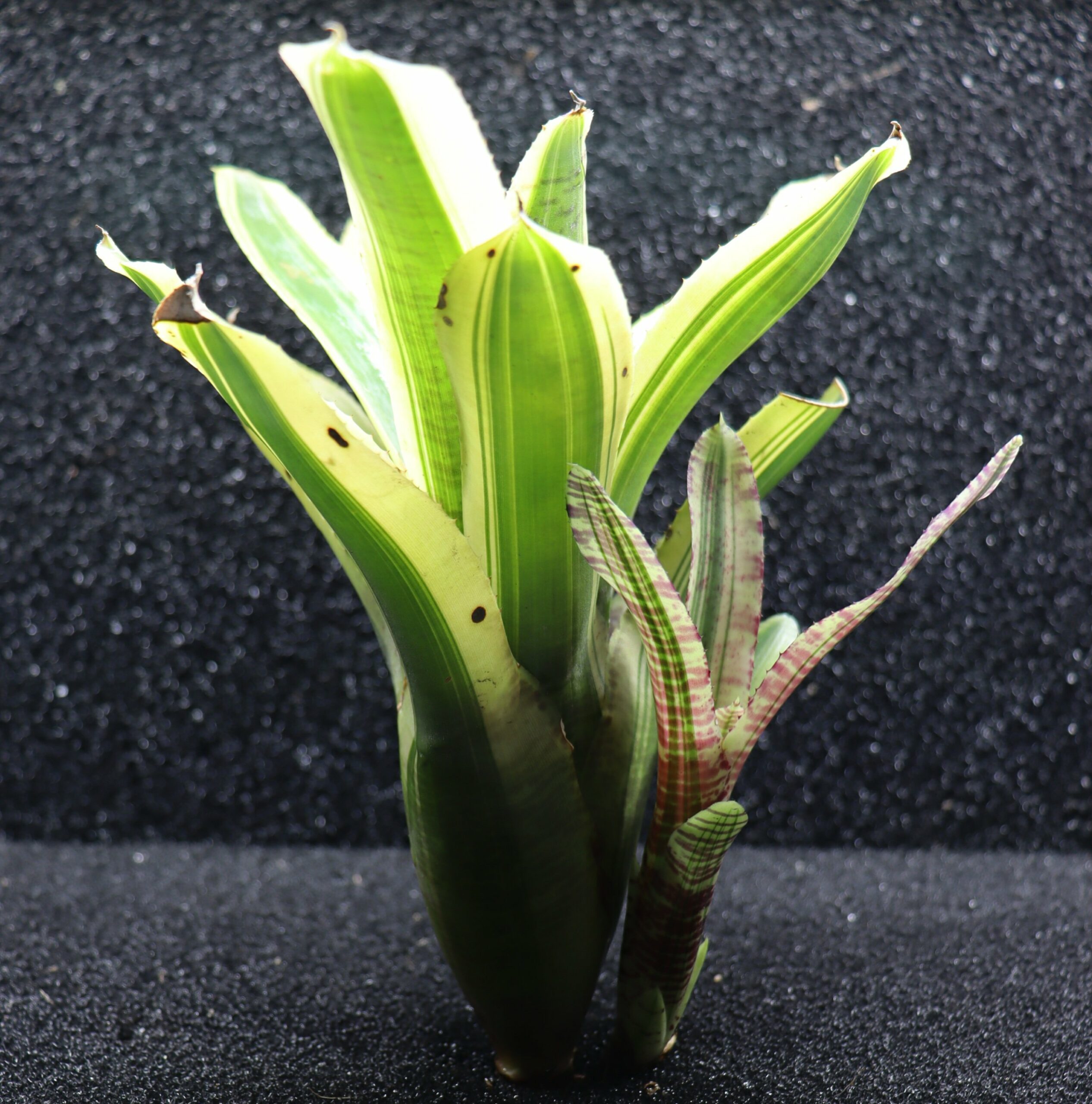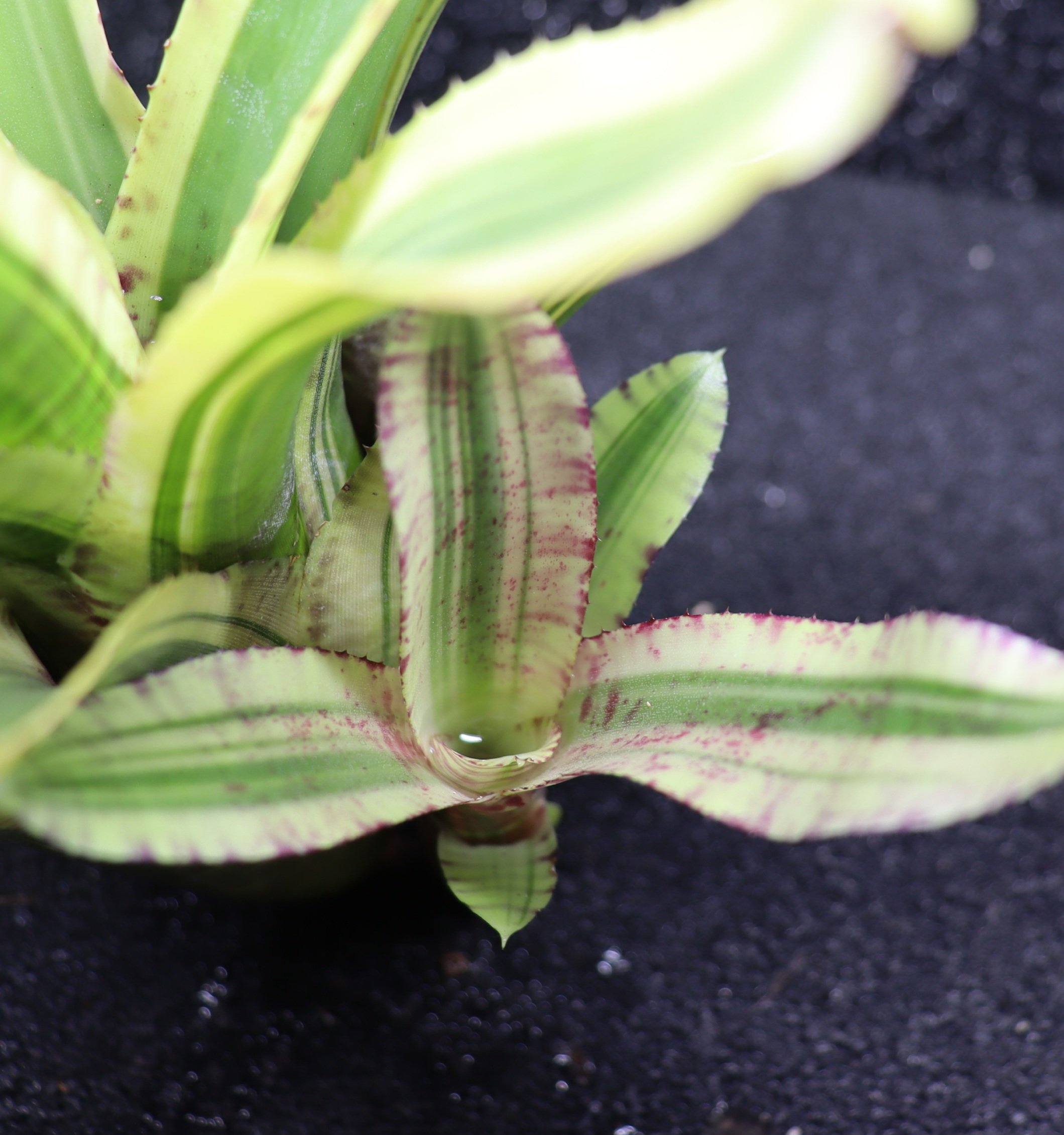 Neoregelia ‘Zeppo’ apporte un éclat lumineux et graphique dans un terrarium tropical. Elle se marie particulièrement bien avec des variétés plus sombres (‘Ninja’) ou à feuillage texturé (Pilea, Begonia), créant un jeu de contrastes saisissant. C’est une variété expressive et facile d’entretien, idéale pour les amateurs de couleurs.