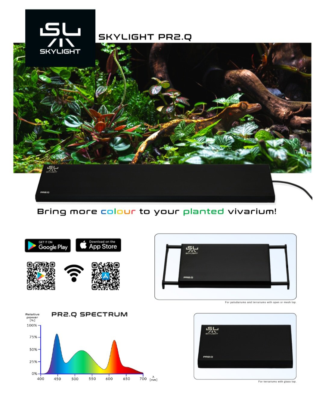Les lampes SKYLIGHT, se distinguent par une conception unique, différente de la majorité des produits d’éclairage destinés aux vivariums et terrariums. Alors que les lampes classiques pour terrariums privilégient généralement une forte luminosité, certains modèles plus avancés sacrifient légèrement cette dernière au profit d’un indice de rendu des couleurs (IRC) plus élevé. Avec les modèles PR2.Q., SKYLIGHT a fait le choix de trouver un équilibre optimal entre ces deux caractéristiques, pour offrir des couleurs vibrantes et intenses.